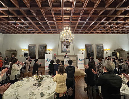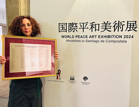 会場となったエウヘニオ・グラネル財団美術館では、展示作品をはじめ、平和のメッセージを展示。後期初日に実施された開催記念セレモニーでは、サンティアゴ・デ・コンポステーラ市より、本展の出展感謝状が出展代表者へ授与されました。同日夕刻からは、歴史深いパラドールで開催記念パーティーが開かれ、同市観光事務局・局長フラビア・ラミル・ミジャレンゴ氏から、出展者へ感謝状の授与式を実施。